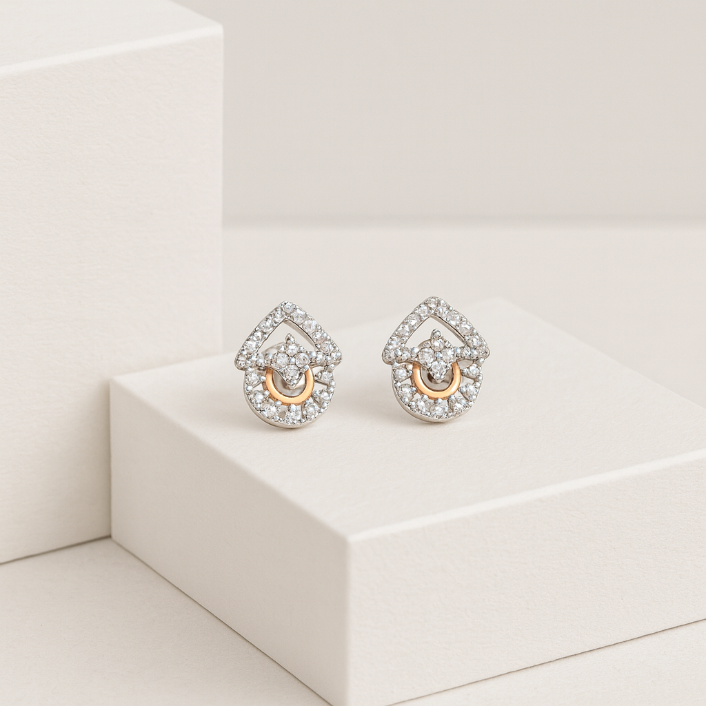 Sleek, refined, and effortlessly chic. These elegant stud earrings feature a distinctive geometric silhouette adorned with shimmering cubic zirconia and finished with a soft rose-gold accent for a contemporary dual-tone look.