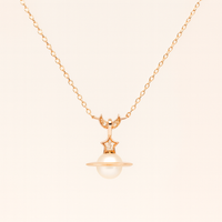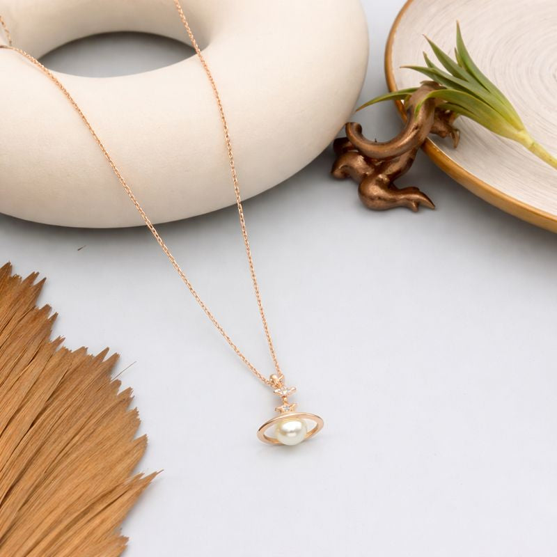 Bring celestial charm to your everyday style with this dreamy Galaxy Pearl Star Pendant. Beautifully crafted in 925 sterling silver and finished with a premium rose-gold polish, the design features a luminous pearl at the center—gracefully wrapped in a planet-inspired orbital ring symbolizing timeless beauty and endless possibilities.