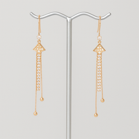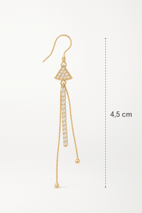 The geometric triangle is adorned with hand-set brilliant round-cut cubic zirconia, delivering radiant sparkle. Crafted in hallmarked 925 sterling silver and finished with thick 3-micron 14K rose gold plating, these earrings offer rich warmth, lasting shine, and enhanced tarnish resistance. The triple-chain tassel design — including one pavé-set chain and two polished chains with delicate gold spheres — adds fluid movement and perfect balance.
