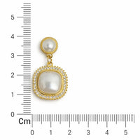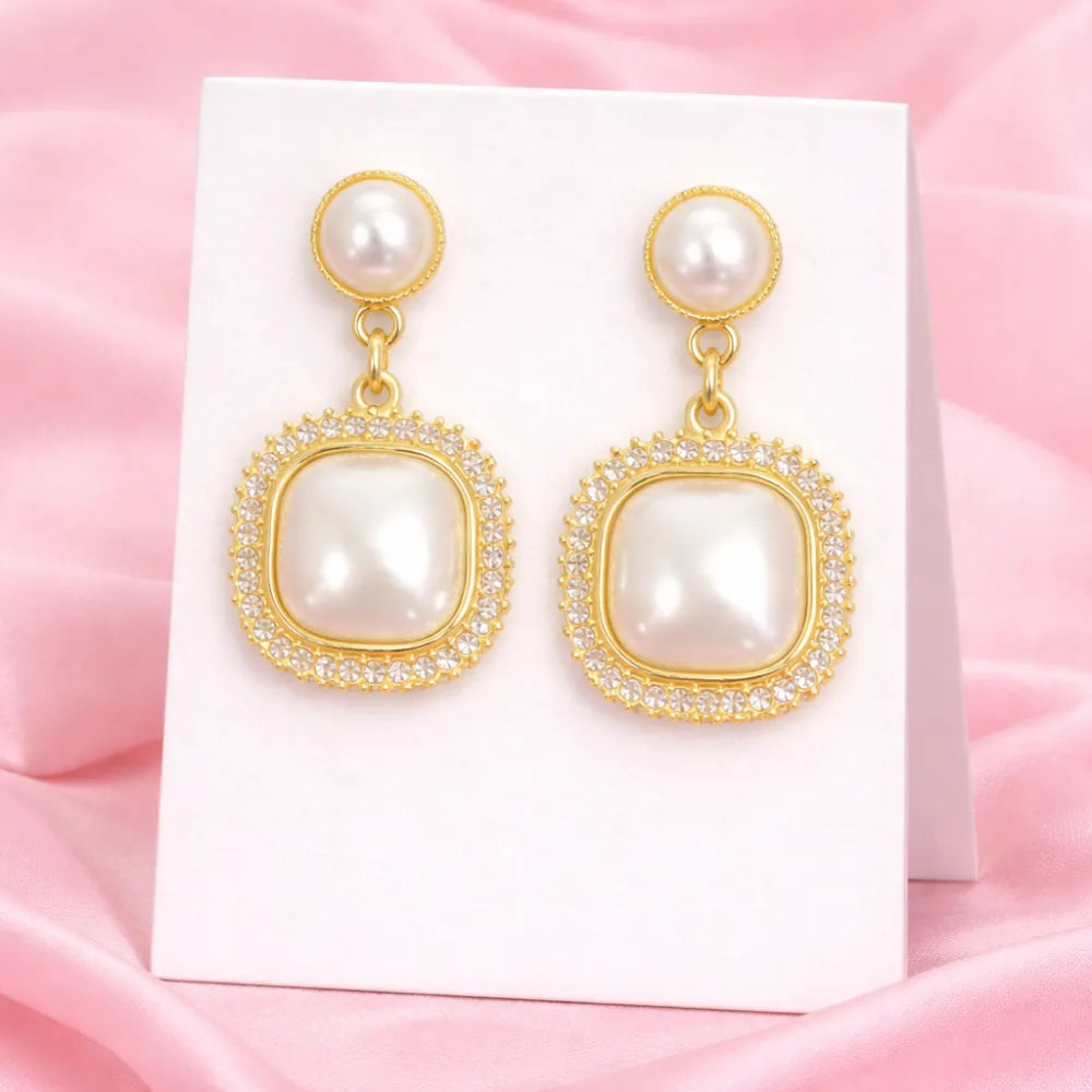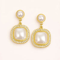 Elevate your elegance with these stunning Royal Pearl Halo Drop Earrings. Designed with a sophisticated square pearl centerpiece framed by a radiant halo of shimmering stones, this pair beautifully blends classic charm with modern refinement. The delicate pearl stud adds a graceful touch, creating a balanced, luxurious silhouette.
